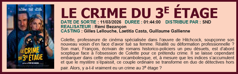 Colette, professeure de cinéma spécialisée dans l’œuvre de Hitchcock, soupçonne son nouveau voisin d’en face d’avoir tué sa femme. Réalité ou déformation professionnelle ? Son mari, François, écrivain de romans historico-policiers un peu désuets, est d’abord sceptique face à l’obsession de Colette pour ce prétendu crime. Il se laisse cependant embarquer dans cette enquête rocambolesque, et, à mesure que les indices s’accumulent et que le mystère s’épaissit, ce couple ordinaire se transforme en duo de détectives hors pair. Alors, y a-t-il vraiment eu un crime au 3 e étage ?